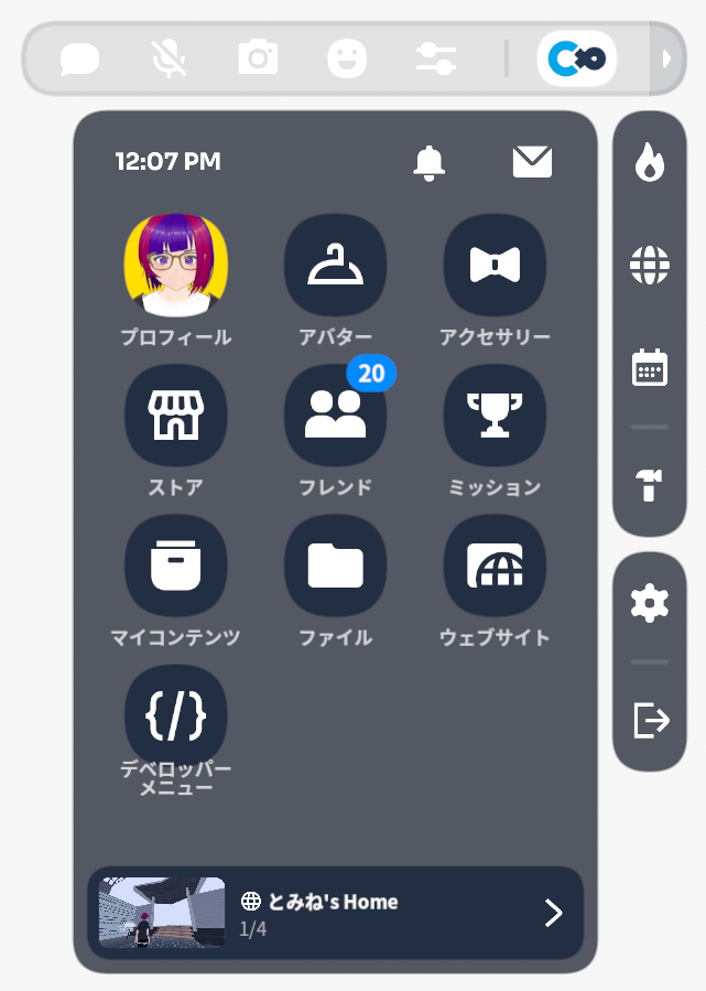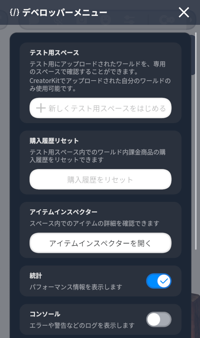 デベロッパーメニューはワールドを作成しているクリエイター向けの機能がまとめられているメニューです。
