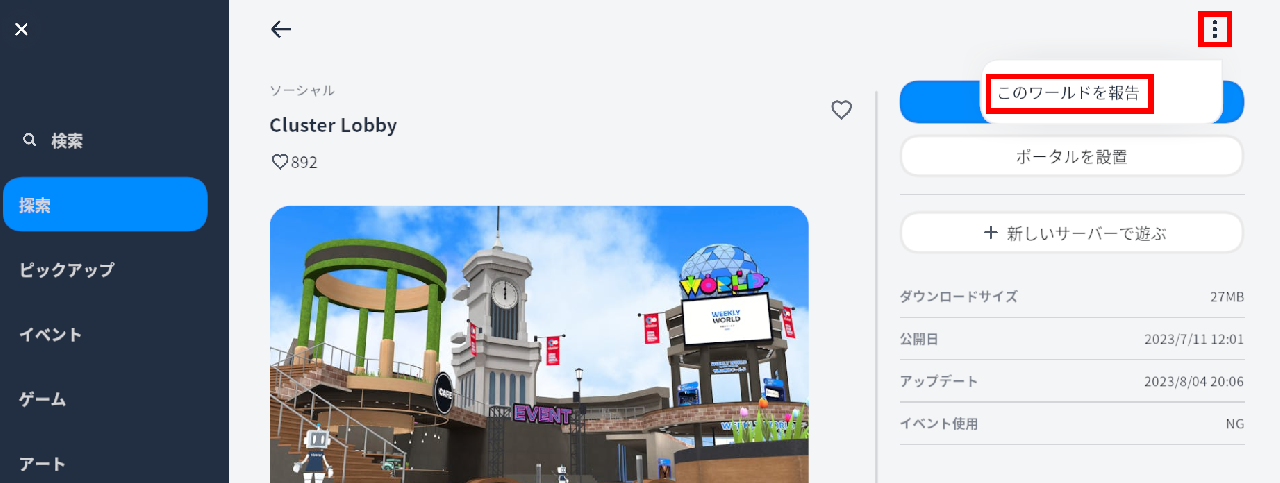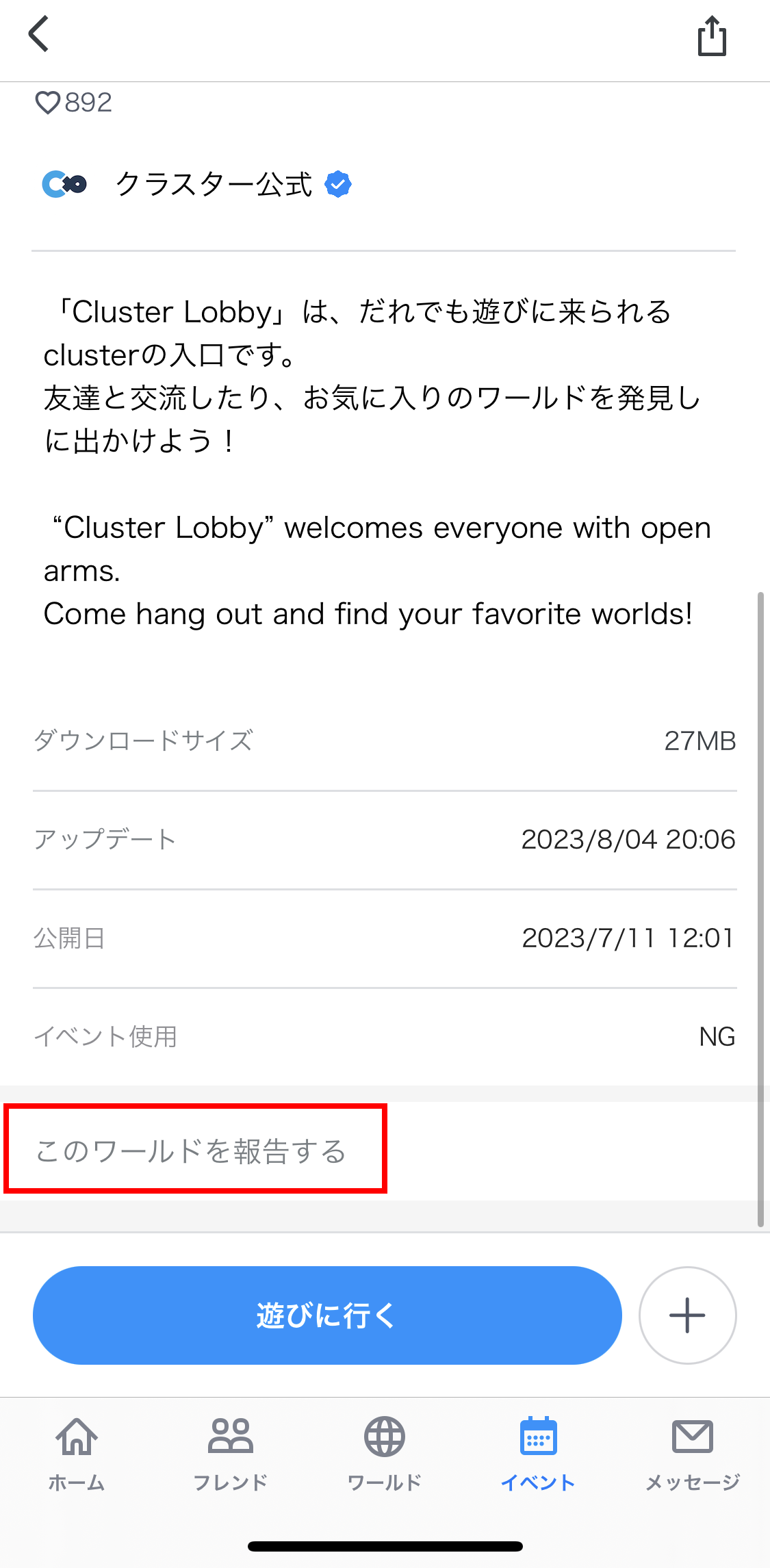 報告の対象となるイベント・ワールドの詳細を開き、ページの一番下にある「このワールドを報告する」(イベントの場合は「このイベントを報告する」)から報告を行ってください。